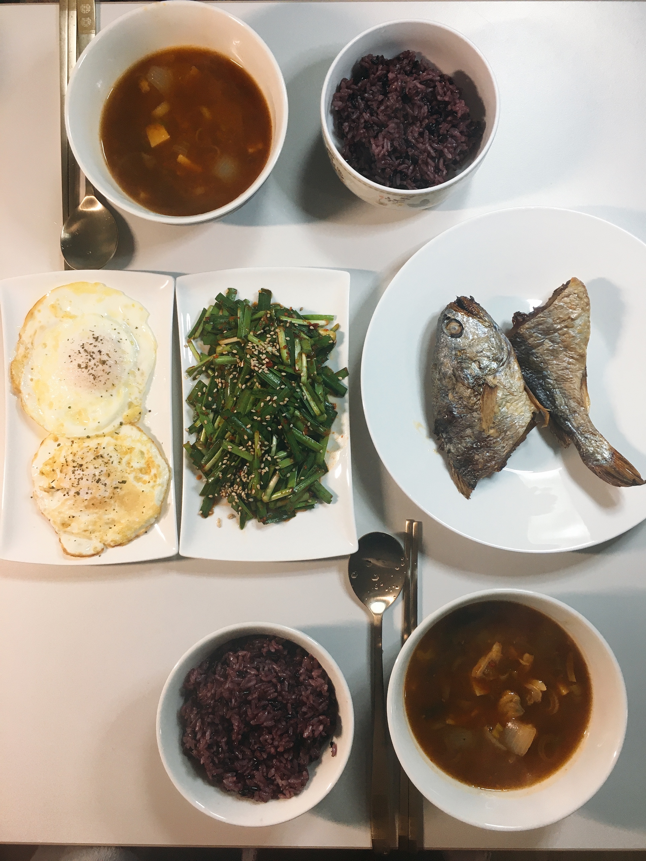 오늘의 아침메뉴 : 흑미밥, 부추무침, 보리굴비, 조개된장국, Fried Egg (밴숙)