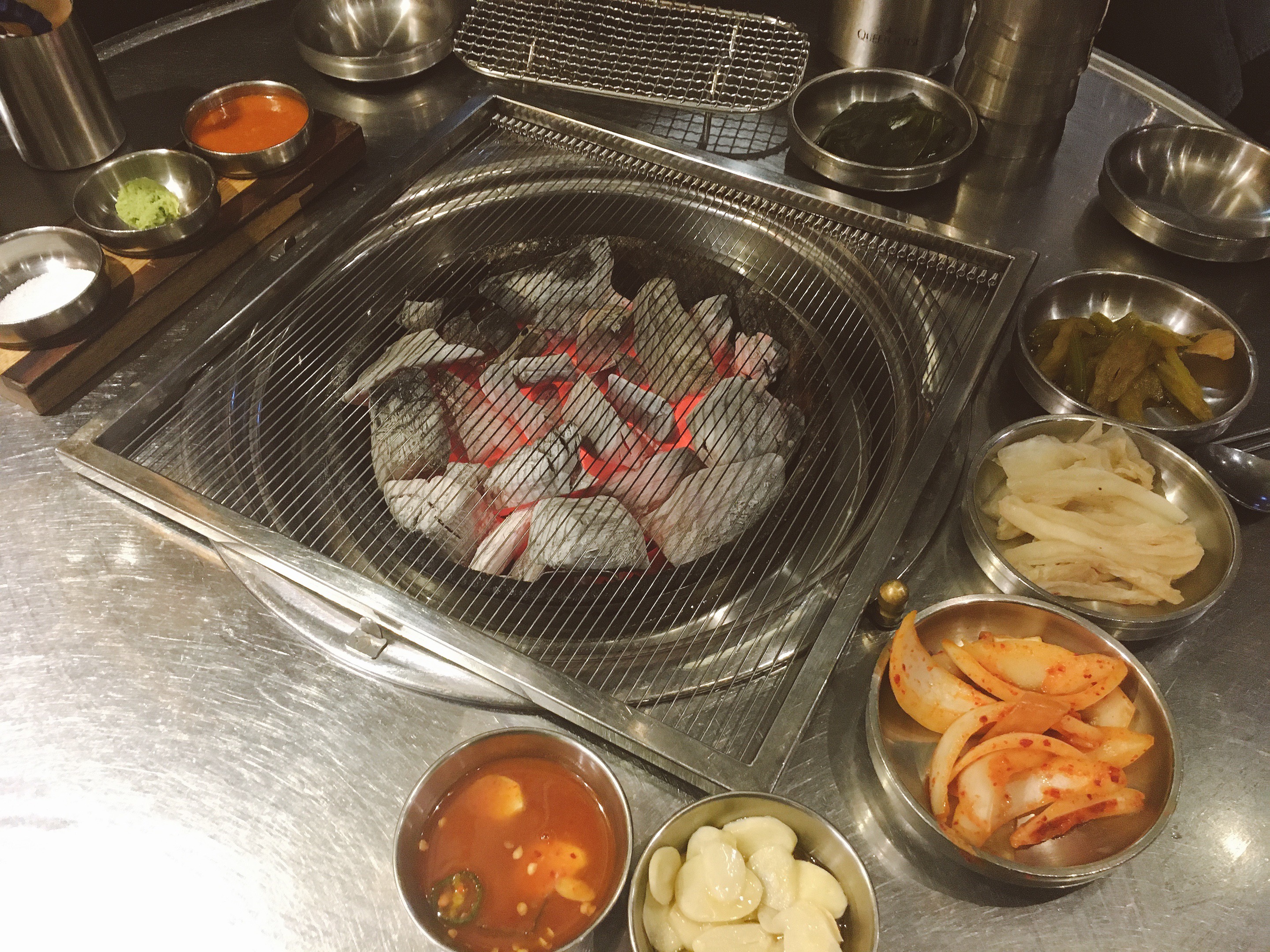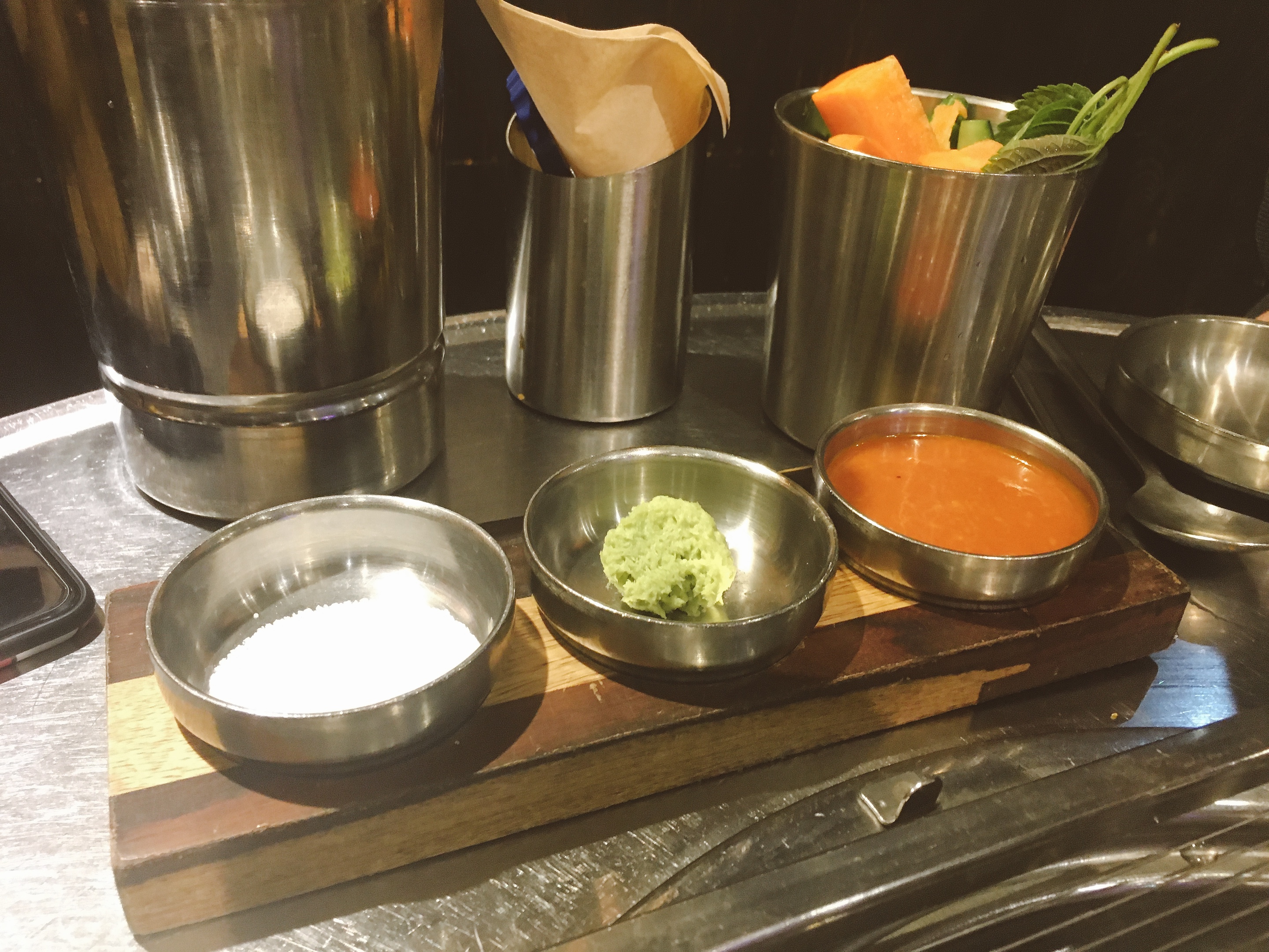 일단 밑반찬과 불을 먼저 올려주셨는데요. 제가 숯 전문가가 아니라 어떤 숯을 쓰는진 모르겠지만 일반 철판에 구워 먹는 것보다는 그릴에 굽는 것을 선호합니다. 물론 숯불구이가 건강이 좋지 않다고 하지만 맛이 좋으면 그만이라고 생각합니다. 부족한 밑반찬은 셀프바에서 추가로 가져다 드실 수 있으며, 명이나물의 경우 추가 요금은 없지만 따로 주문을 해주셔야 합니다. 고기를 먹기에는 간단하지만 필요한 모든 밑반찬이 구성되어있다고 생각합니다. 특히 생고추냉이는 제 취향을 저격해 줬습니다. 이런 작은 부분이 손님을 끄는데 매력포인트가 된다는 점을 잘 알고 계신 듯합니다.