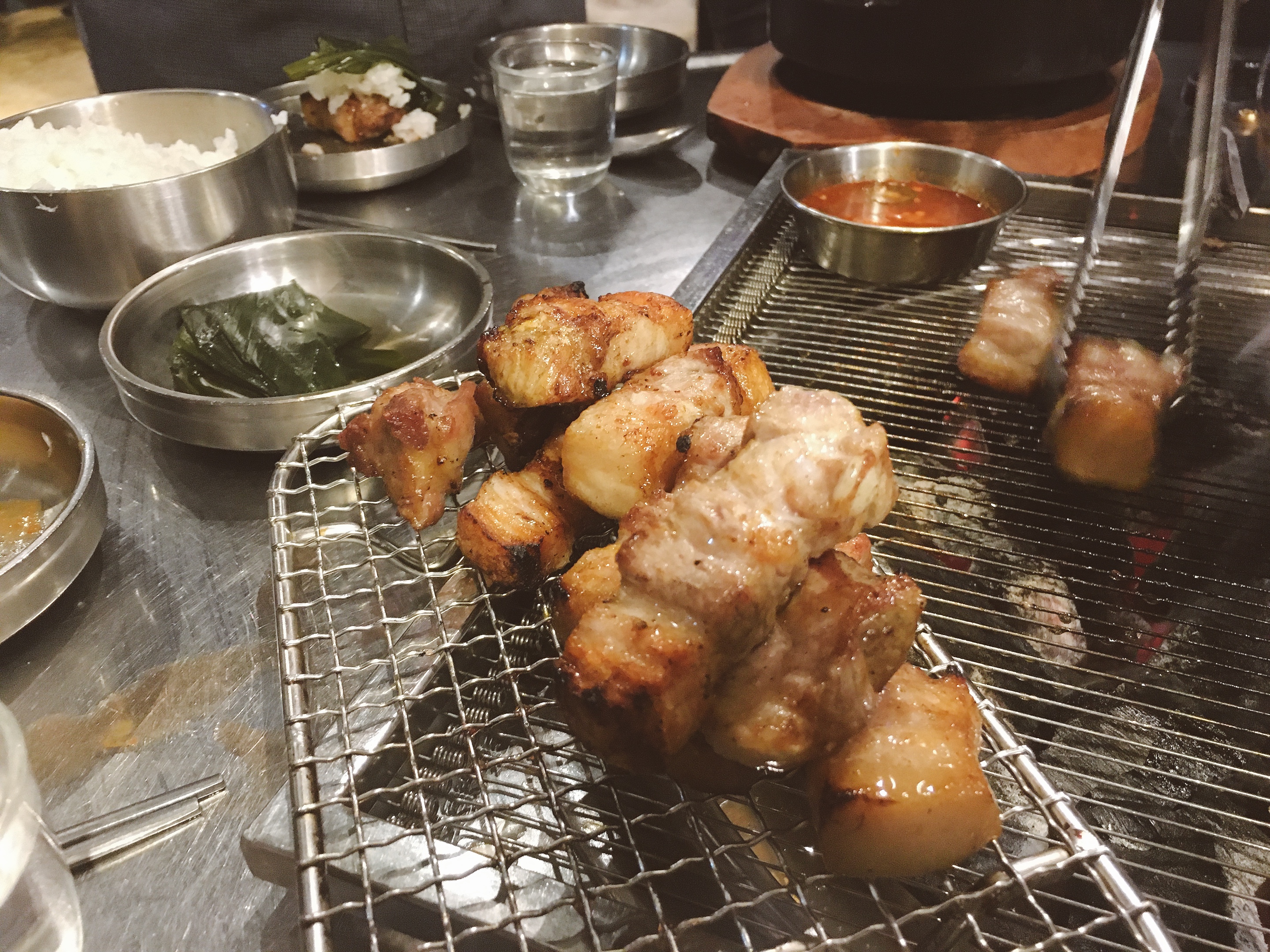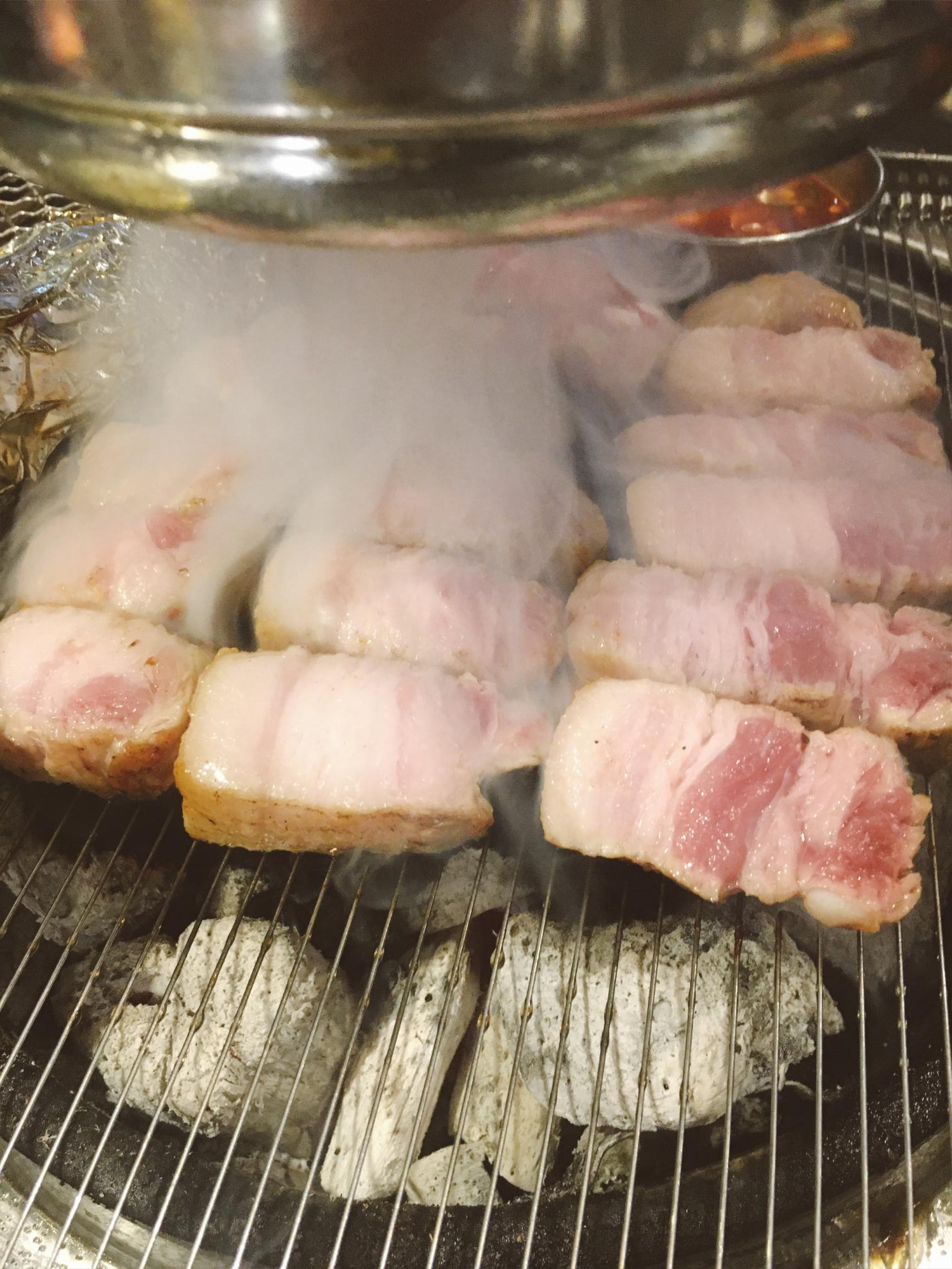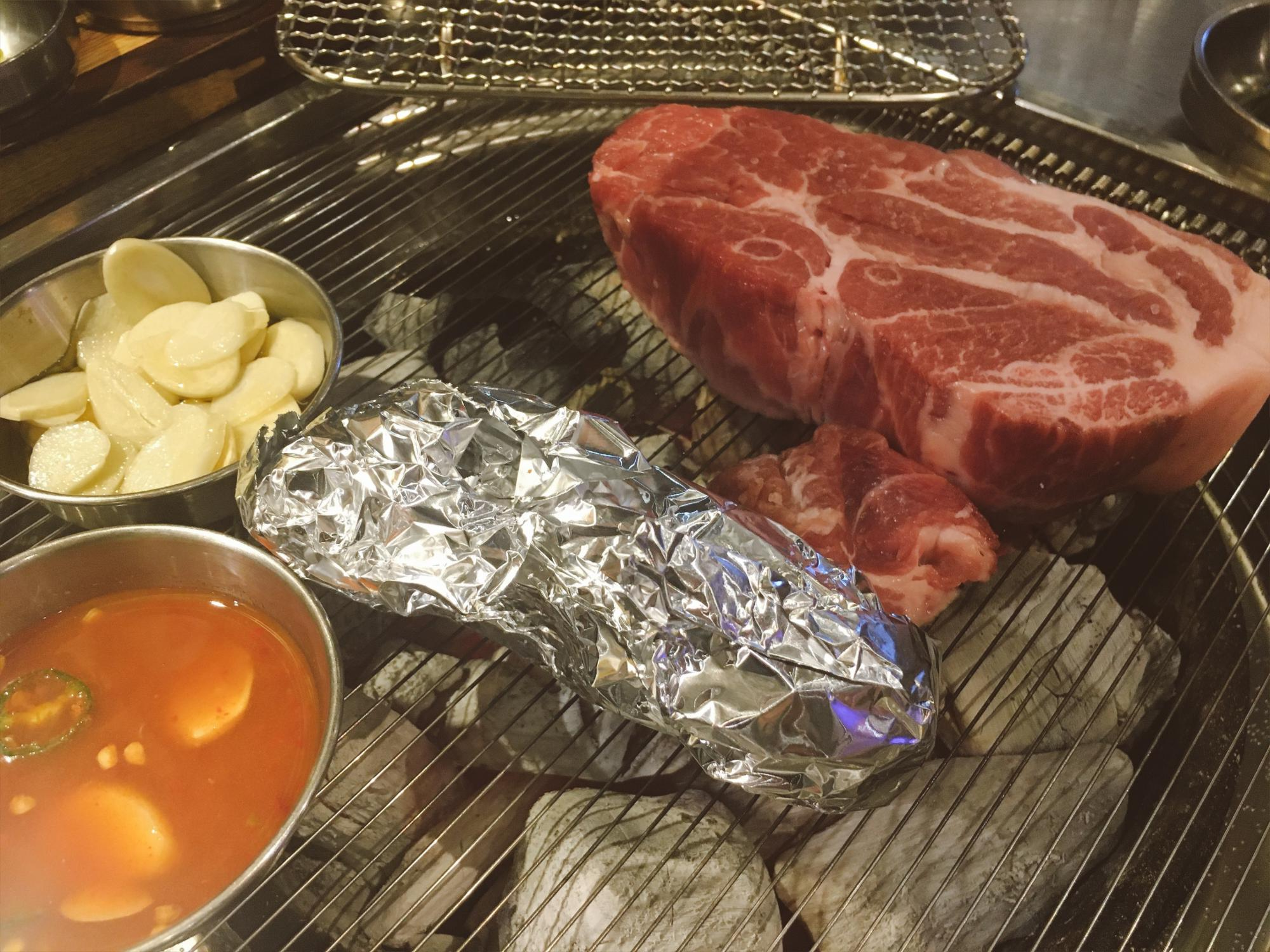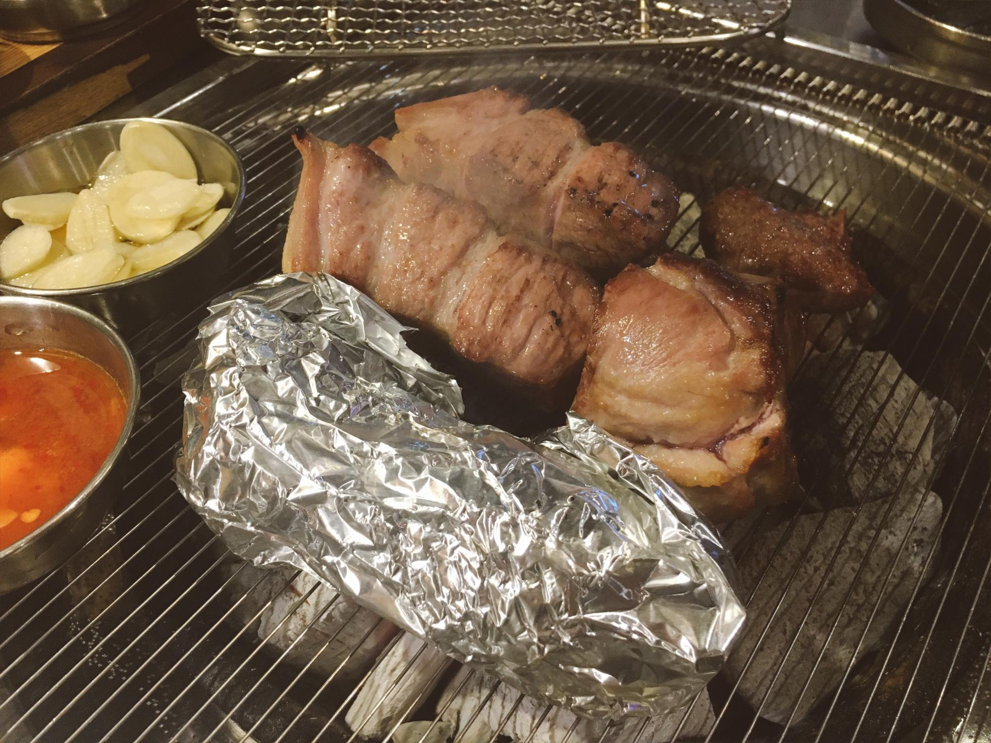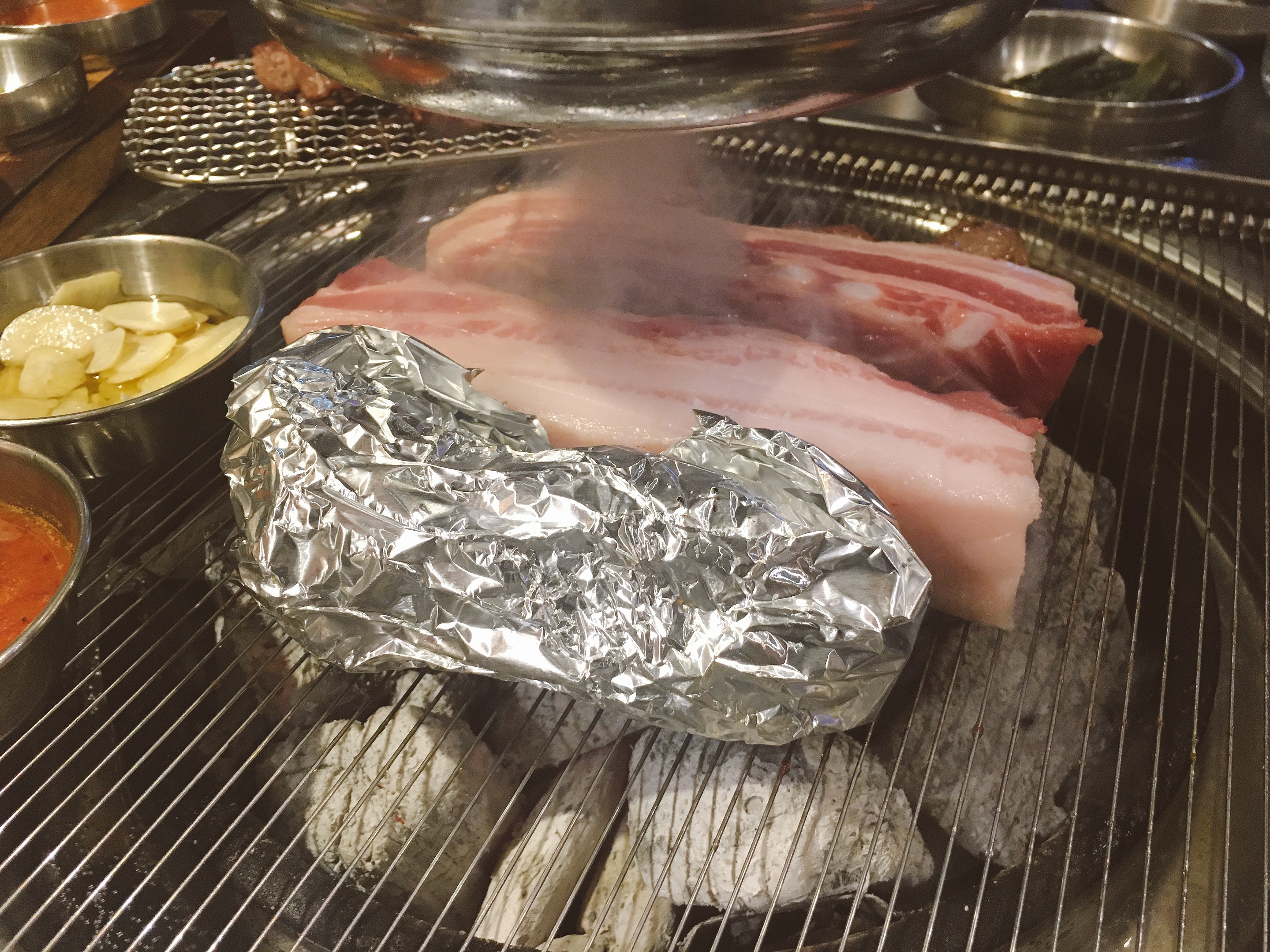 자 일단 목에 기름칠을 먼저 해줘야 하기에 삼겹살을 먼저 올려 봅니다. 고기는 점원분이 알아서 잘 케어해 주시니 걱정 안 하셔도 될 것 같습니다. 불위에 은박지에 싸놓은 것(?)의 정체는 새송이 버섯입니다. 요즘(?) 트렌드는 아니지만 통 버섯을 구워 먹는 저에겐 오~ 이런 것 까지(?)라는 감탄을 자아내게 해 주셨습니다. 이러니 고기 맛이 맛있게 느껴질 수밖에 없겠지요.