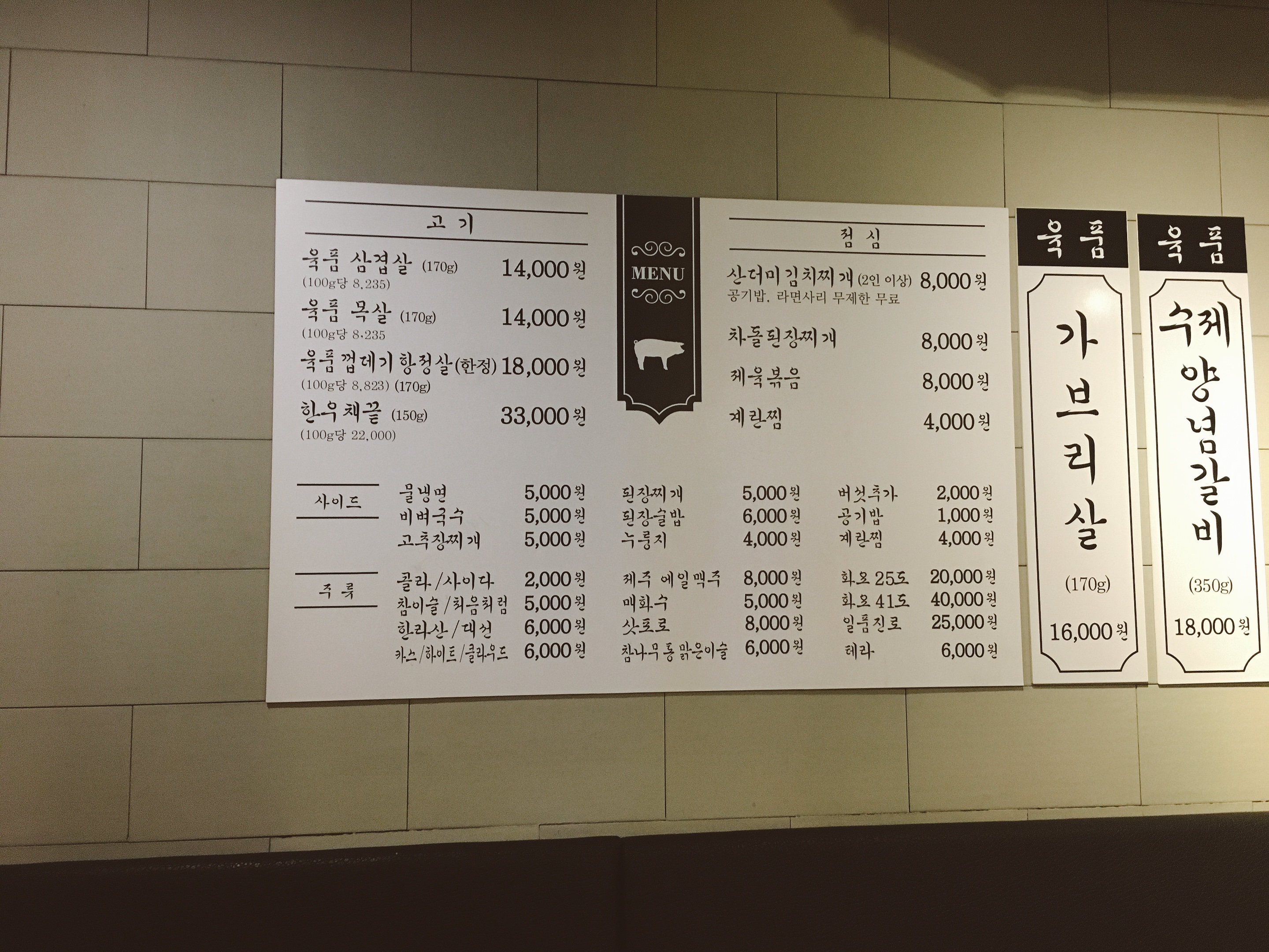 일단 메뉴판을 보시면 가격이 매우 착한 편입니다. 전날 강강술래의 가격을 보고 육품의 가격을 보니 마음이 편해집니다. 삼겹살이나 목살의 경우 보통 서울이나 지방의 여느 식당에서 판매하는 가격대였으며, 사이드 메뉴 또한 적당한 가격에 형성되어 있었습니다. 다만 서울이라 그런지