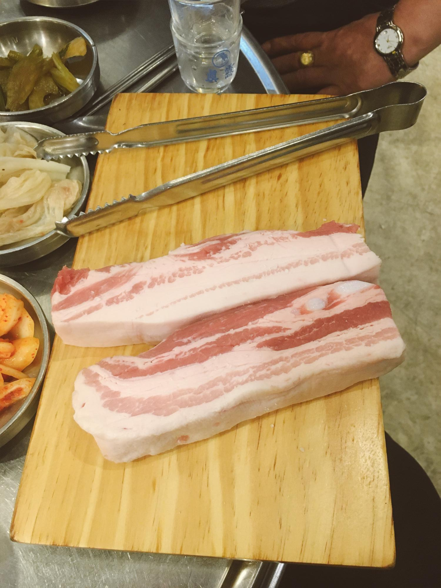 생각보다 양이 많아서 놀랐습니다. 저 정도면 일반 근고기 집에서 먹는 양이 아닐까 해서 여쭤보니 2인분이 맞다고 하십니다. 삼겹살 또한 지방과 살이 적당한 비율로 배치되어 있는 삼겹살을 주셨습니다. 고기 상태는 그냥 육안으로 봐도 좋아 보이는 그런 상태였습니다.