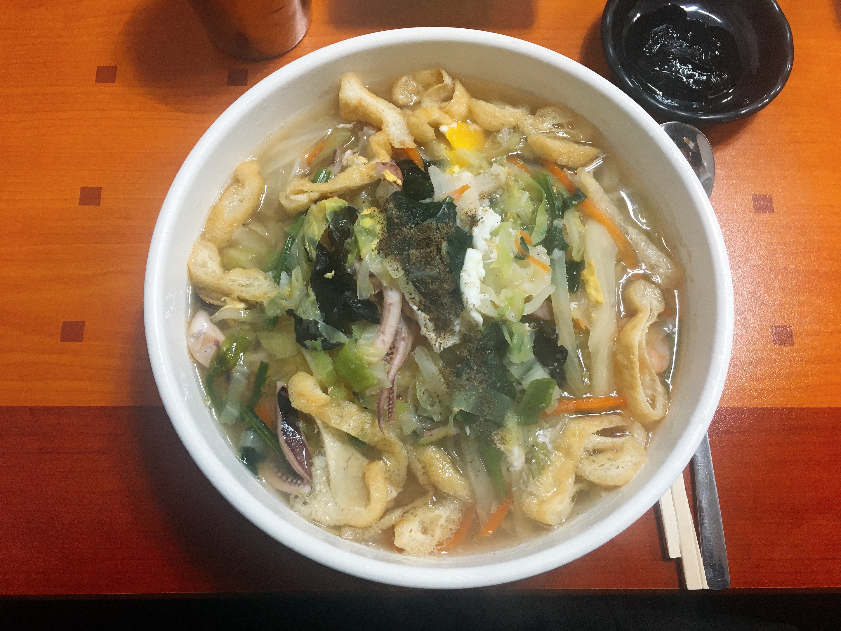 토핑으로는 유부, 양배추, 새우, 오징어, 계란, 목이버섯 등등이 올라가 있습니다.
