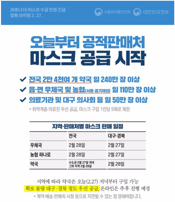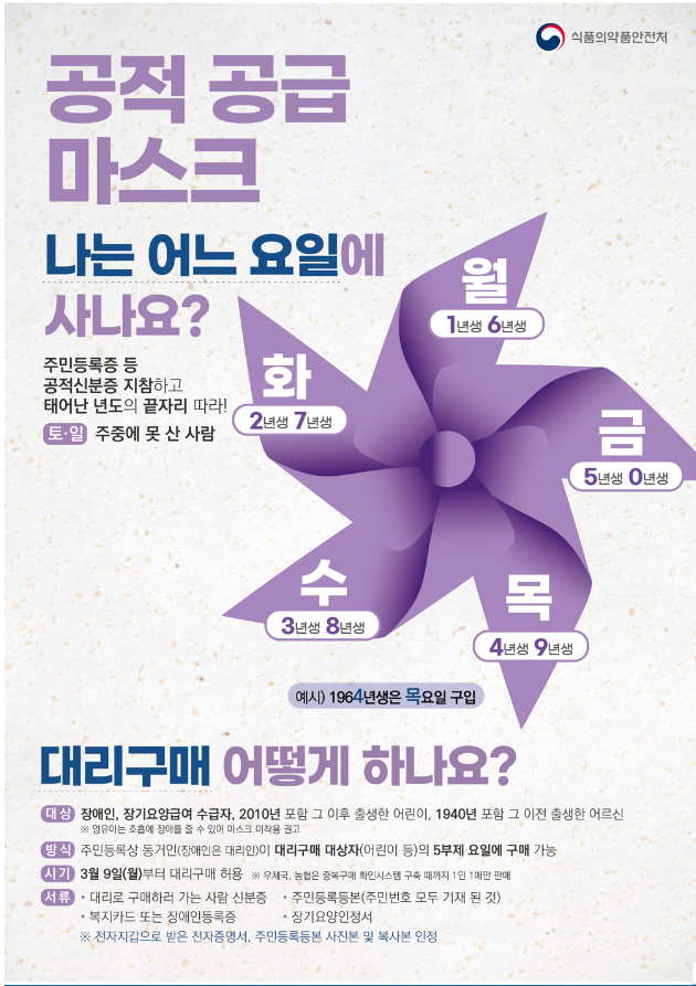 정부에서 2.27일 코로나 19 마스크 수급안정 관련 대책을 내놓았는데요. 바로 공적 마스크 5부제를 도입한다는 내용입니다. 지역별 우체국, 농협, 약국 등에서 일 400만 장의 마스크를 공급하기로 결정했네요. 공급 시 혼선을 방지하기 위해 월요일~금요일까지 5일에 걸쳐 출생 연도 끝자리로 나눠 공급하고 있습니다.