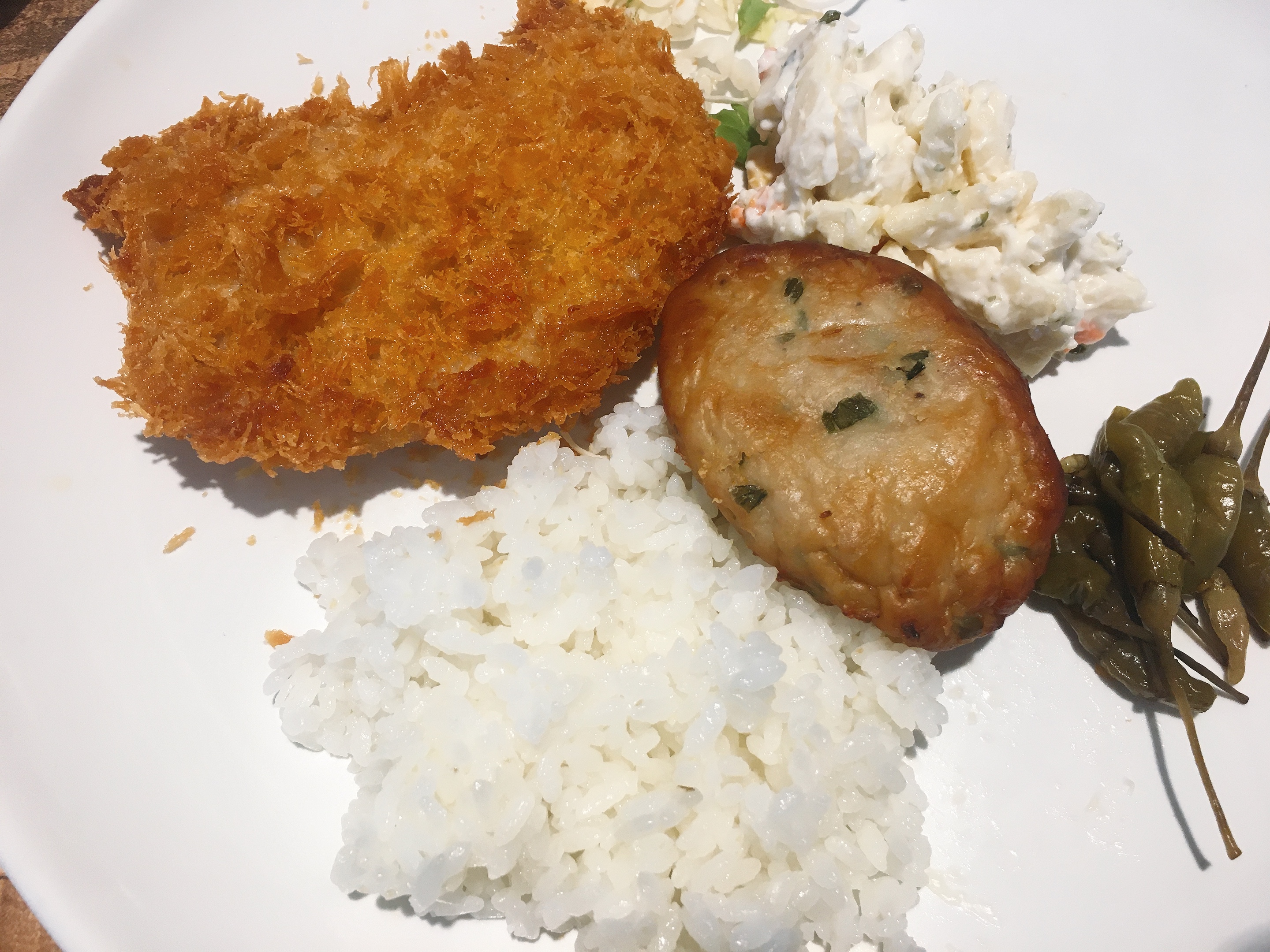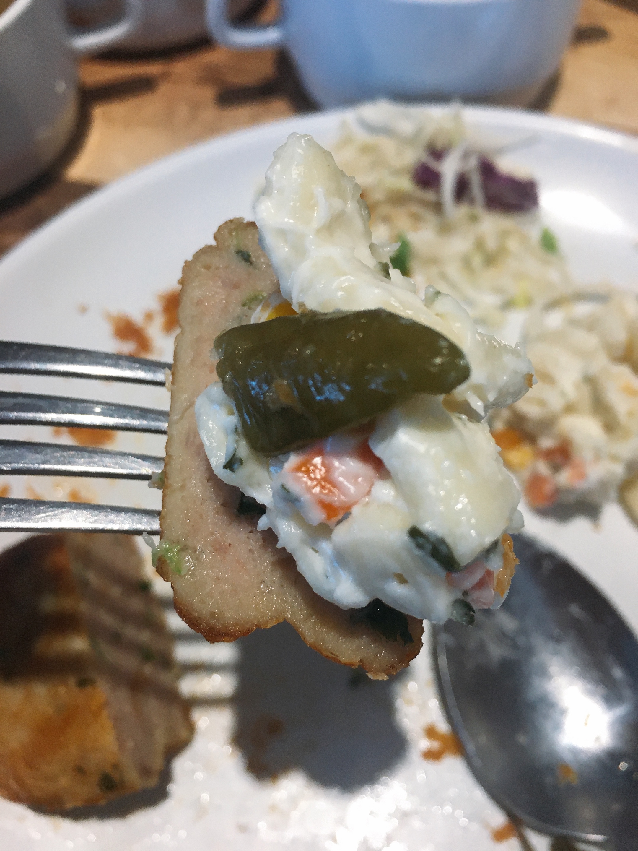 합박스테이크는 매번 하나씩 가져다 먹긴 하지만 아직까지 적응이 잘 되지 않는 메뉴입니다. 사실 평소에도 함박스테이크를 즐겨 먹지 않고, 함박스테이크 자체가 갖은 양념들과 다진고기로 한번 가공된 상태기 때문에 우리가 주변에서 접할 수 있는 가공식품 맛이 진하게 느껴져 많이 먹는 편은 아닙니다. 이날도 한점 주워 왔지만 마카로니 샐러드 덕분에 다 먹을 수 있었습니다. 매번 알면서도 당하는 그런 느낌입니다. ㅎㅎ