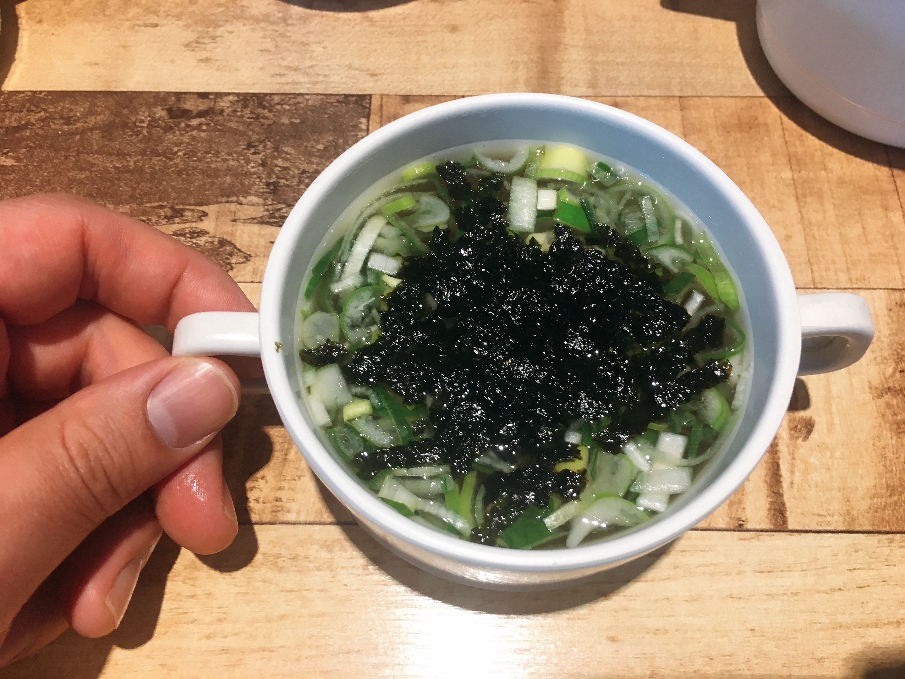 마지막으로 잔치국티 한잔(?) 해봅니다. 잔치국수를 먹기에는 너무 배가 부르니 이렇게 파와 김만 추가하여 입가심을 해봅니다. 잔치국수 육수의 약간 칼칼한 맛과 파향이 어울어져 돈까스의 느끼함을 크리닝 해주는 역할을 합니다. 티 처럼 우아하게 손으로 들고 마시는건 기본 교양인거 아시죠?